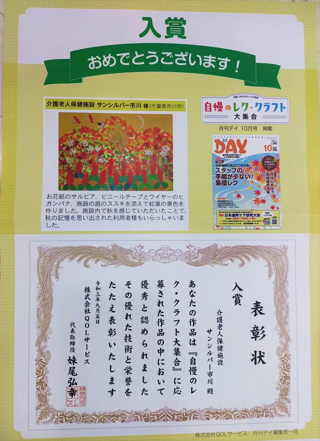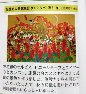 2021/09/17 月刊デイ10月号に当施設のご利用者様の作品が掲載されました! 3度目の入賞です㊗ 彼岸花のワイヤービニールテープを丸めたり、サルビアの花をお花紙でよじって作ったり、 細かい作業でしたが、楽しんで制作して頂きました。 中央のススキは施設の庭からとってきたものです! ヒガンバナのワイヤーはソフトワイヤーを使用していますが、利用者様がけがをしないよう気を配りました。 施設の中でも華やかな秋を感じて頂ければと思います🍁 1+