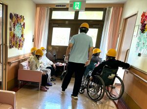 ヘルメットを被り、各階避難口まで移動し、避難経路を確認します。