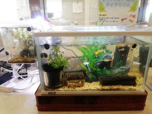 受付前の華やかなシクラメン(フェアリーピコ)とかわいらしい観賞魚🐠