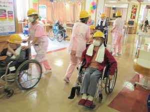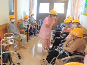 各フロアの職員とご利用者様はヘルメットを被り、避難誘導を行います。