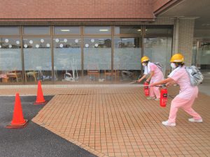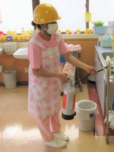水の入っている訓練用の消火器を使い手順を確認しました。