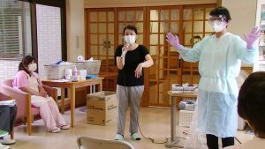 感染管理認定看護師の方に、施設内ゾーニング(病原体によって汚染されている区域と汚染されていない区域を区分けすること)、手指衛生の方法、個人防護具の取り扱い等助言して頂きました。平日の業務時間内のため受ける人数は限定されていますが、ビデオ撮影し、職員全員に周知できるようにしております。